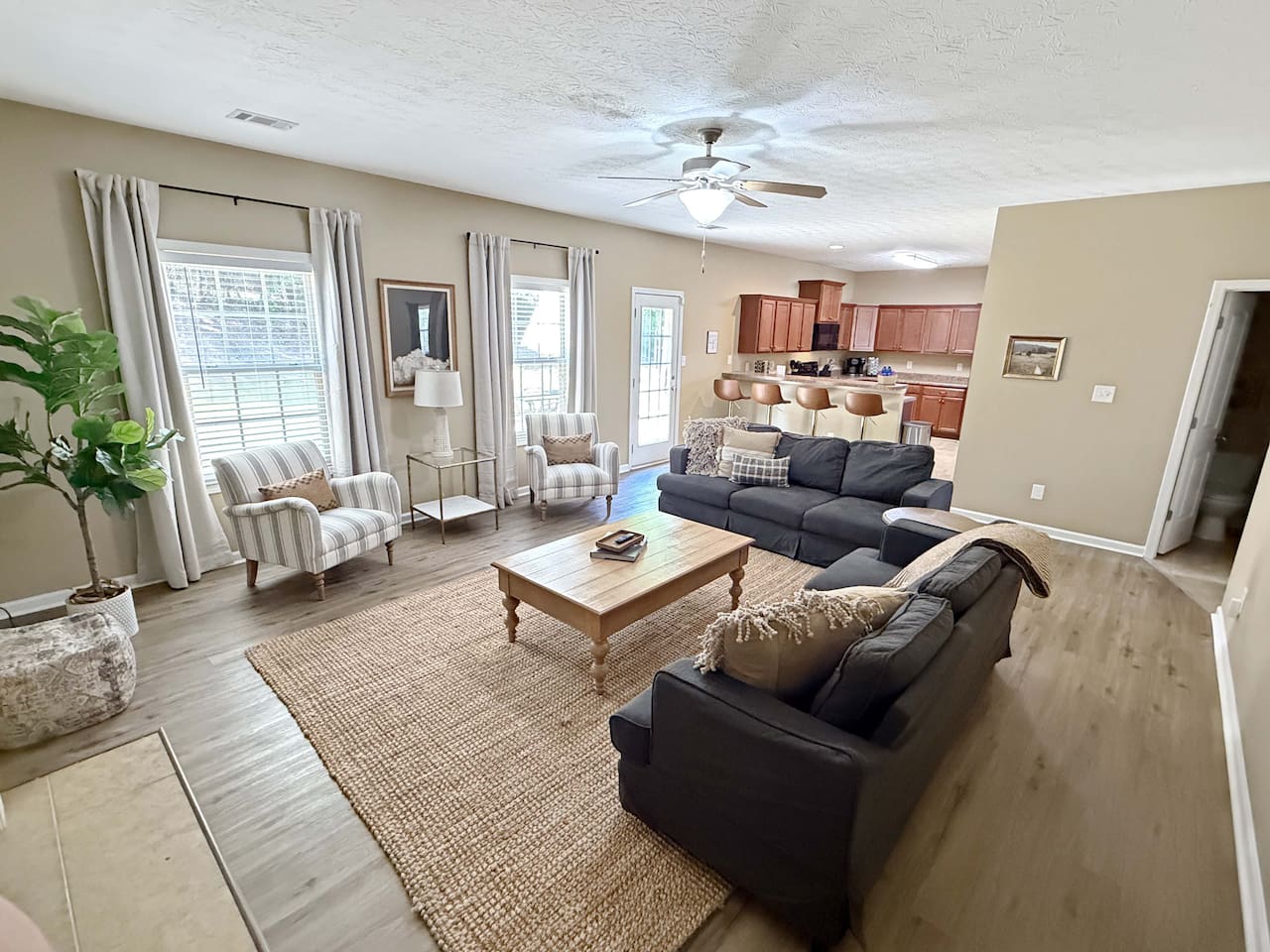 Welcome to The Gathering House on Bunker Hill — a spacious, comfortable home designed for families and groups coming together for life’s biggest moments in Columbus. Located just minutes from Fort Benning, this home is ideal for graduation weekends, Turning Green ceremonies, reunions, and milestone visits where everyone wants to stay under one roof. With four large bedrooms (two kings and two doubles in each of the other rooms), 2.5 bathrooms, a generous living room, and a large dining area featuring a pool table, there’s plenty of room for everyone to spread out while still feeling connected. The back patio with firepit creates the perfect setting for evening conversations, and the oversized driveway offers easy parking for 4–5 vehicles — a rare convenience for larger groups traveling together. You’ll be close to shopping, restaurants, and everyday conveniences while enjoying a quiet residential setting that feels welcoming after long days on base or out celebrating. This home isn’t about frills — it’s about comfort, space, and giving families a place to gather, relax, and make memories together.